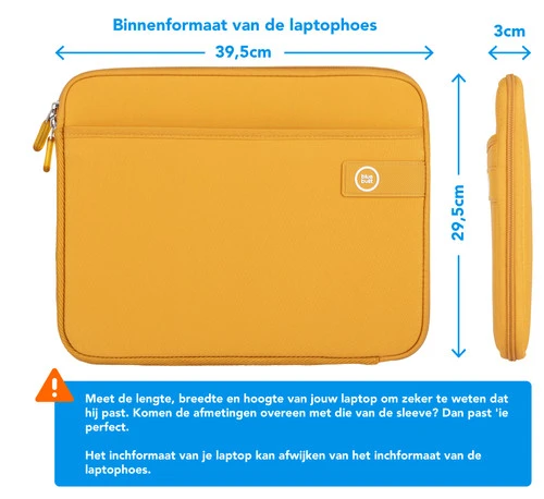De binnenmaten van deze laptophoes zijn 3 x 39,5 x 29,5 cm.