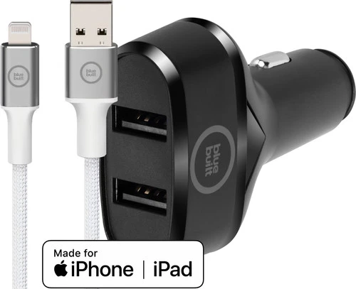 Je komt altijd met een opgeladen iPhone aan op je bestemming met de BlueBuilt Autolader met 2 Usb A Poorten 12W Zwart + Lightning Kabel 1,5m Nylon Wit. De Lightning kabel sluit je ook aan op bijvoorbeeld je AirPods of iPad. Dankzij de 2 usb A poorten laad je 2 apparaten tegelijk op. Zo maak je niet alleen de hele rit gebruik van je smartphone, maar ook van bijvoorbeeld je dashcam, navigatiesysteem of e-reader. Of laad de tablet waar je kinderen op de achterbank mee zitten te spelen op. Gebruik je eigen usb A oplaadkabel om de tweede usb poort te gebruiken. De meegeleverde kabel is van nylon en gaat langer meer dan een kunststof kabel. Deze autolader kan niet snelladen. Heb je weinig tijd en wil je je smartphone nóg sneller opladen? Gebruik dan een snellader.